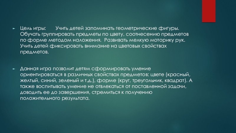 Слайд 3Цель игры:       Учить детей запоминать геометрические фигуры. Обучать группировать предметы по