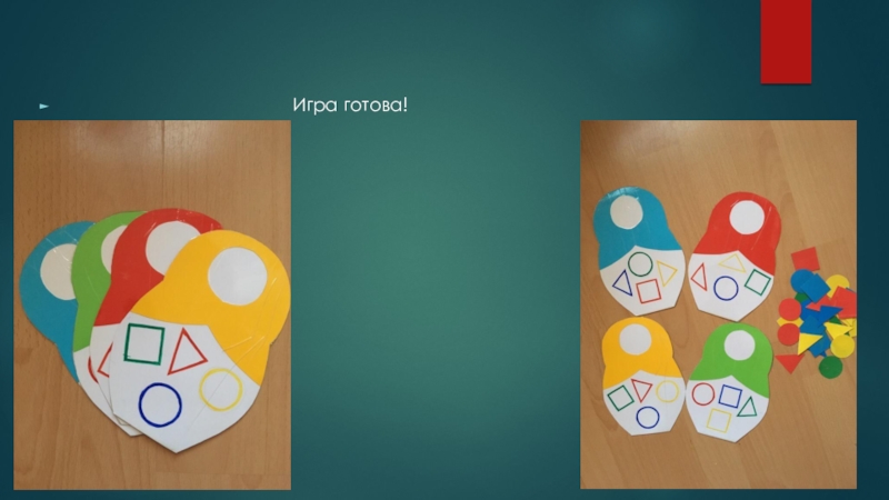 из цветного картона вырезаем фигуры в соответствии с фигурами на матрёшках. Дополнительно можно обклеять матрешки и фигуры скотчем(для долговечности)