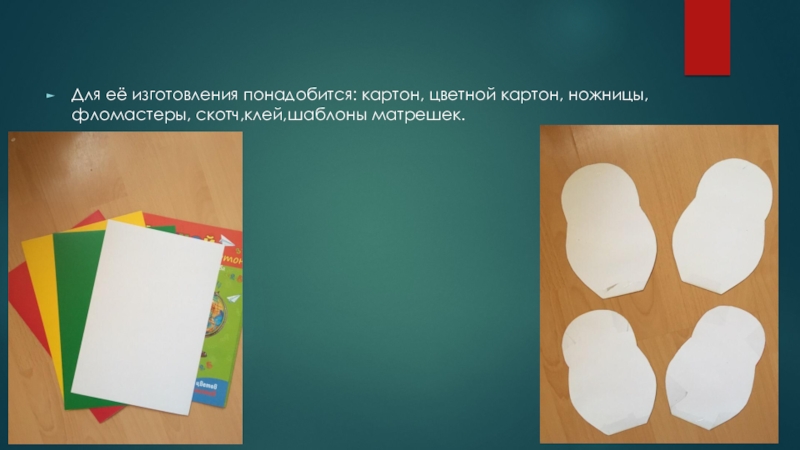 Слайд 4Для её изготовления понадобится: картон, цветной картон, ножницы, фломастеры, скотч,клей,шаблоны матрешек.