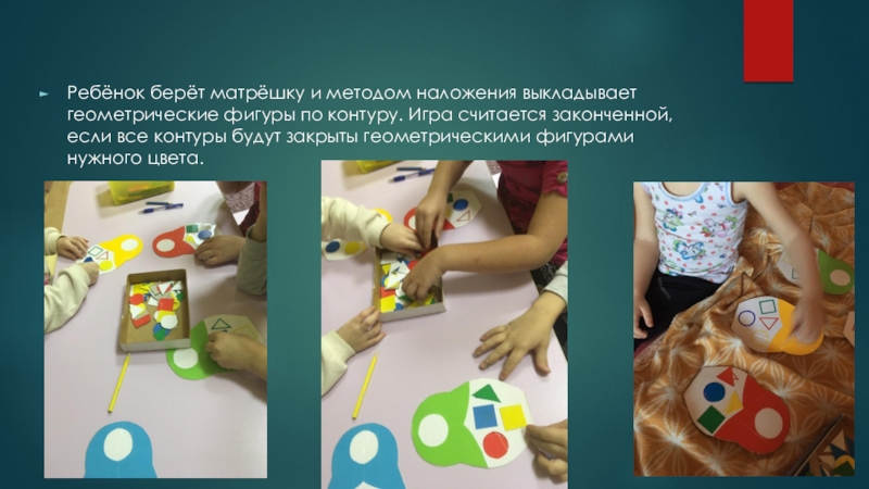 Ребёнок берёт матрёшку и методом наложения выкладывает геометрические фигуры по контуру. Игра считается законченной, если все контуры