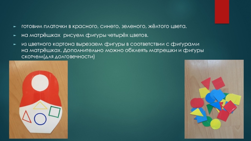 готовим платочки в красного, синего, зеленого, жёлтого цвета.на матрёшках рисуем фигуры четырёх цветов.из цветного картона вырезаем фигуры