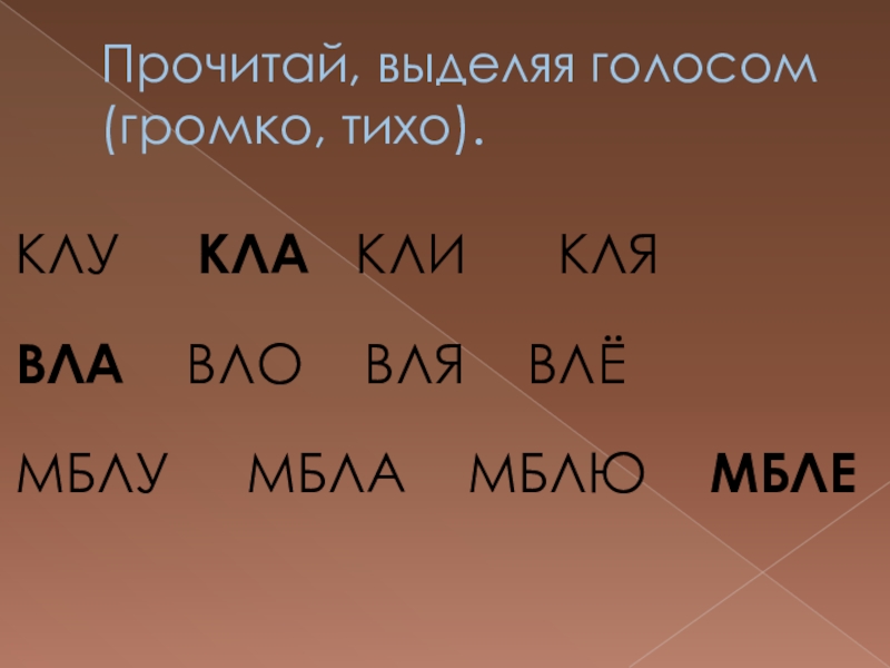 Прочитай, выделяя голосом (громко, тихо).КЛУ КЛА КЛИ КЛЯ ВЛА ВЛО ВЛЯ ВЛЁ МБЛУ МБЛА МБЛЮ МБЛЕ