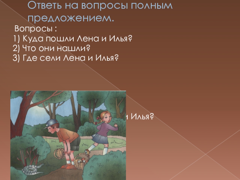 Ответь на вопросы полным предложением.Вопросы :1) Куда пошли Лена и Илья? 2) Что они нашли?3) Где сели
