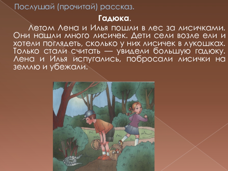 Послушай (прочитай) рассказ.Гадюка.    Летом Лена и Илья пошли в лес за лисичками. Они нашли