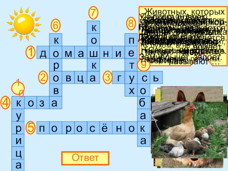 12345678910ОтветЖивотных, которыхразводят люди, кор-мят их, строят для них жилища, забо-тятся о потомстве,     называют