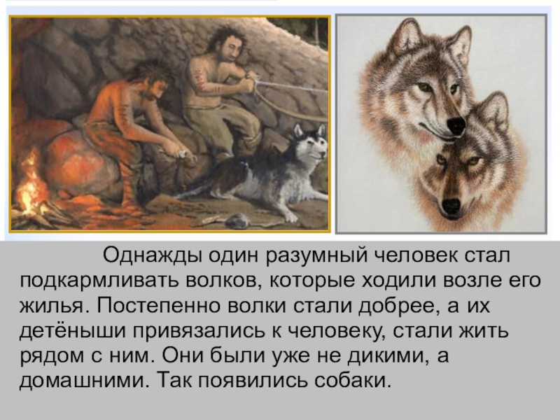 подкармливать волков, которые ходили возле его жилья. Постепенно волки стали добрее, а их детёныши привязались к человеку, стали жить рядом с ним. Они были уже не дикими, а домашними. Так появились собаки.