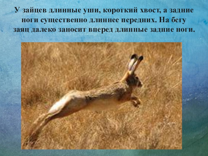 Слайд 7У зайцев длинные уши, короткий хвост, а задние ноги существенно длиннее