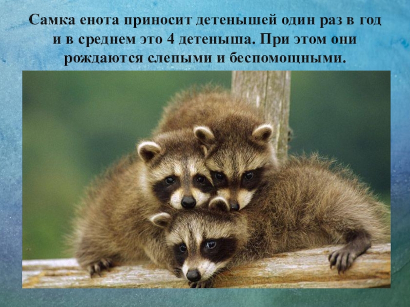 Слайд 17Самка енота приносит детенышей один раз в год и в среднем