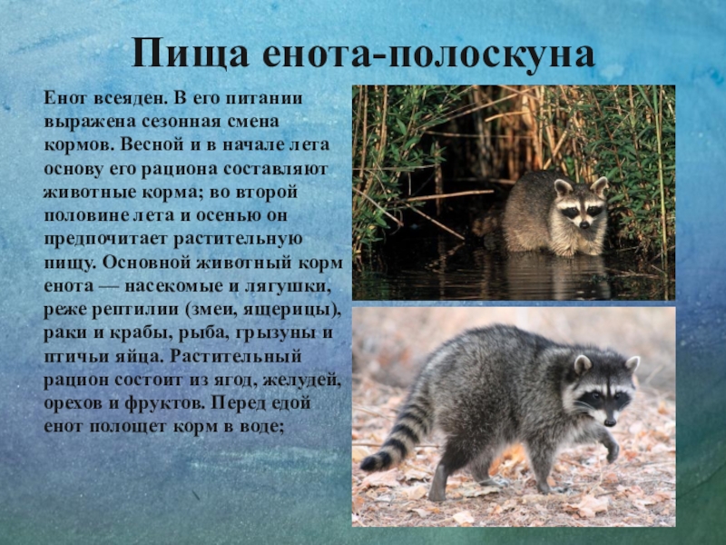 Слайд 15Енот-полоскун ловко лазает по деревьям; Благодаря прекрасному ночному зрению енот уверенно