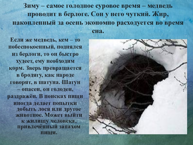 Слайд 5Зиму – самое голодное суровое время – медведь проводит в берлоге.