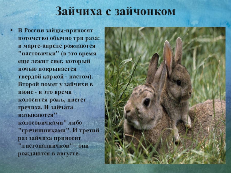рождаются "настовички" (в это время еще лежит снег, который ночью покрывается твердой коркой - настом). Второй помет у зайчихи в июне - в это время колосится рожь, цветет гречиха. И зайчата называются"колосовичками" либо "гречишниками". И третий раз зайчиха приносит "листопадничков" - они рождаются в августе.
