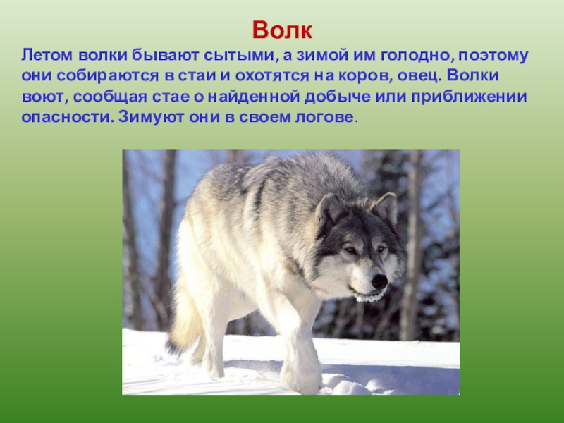 в стаи и охотятся на коров, овец. Волки воют, сообщая стае о найденной добыче или приближении опасности. Зимуют они в своем логове.