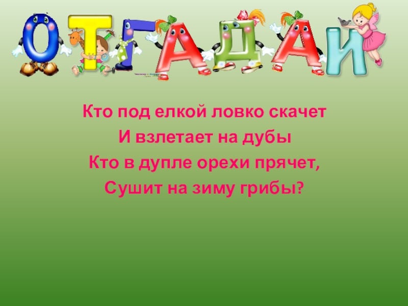 Кто под елкой ловко скачетИ взлетает на дубыКто в дупле орехи прячет,Сушит на зиму грибы?