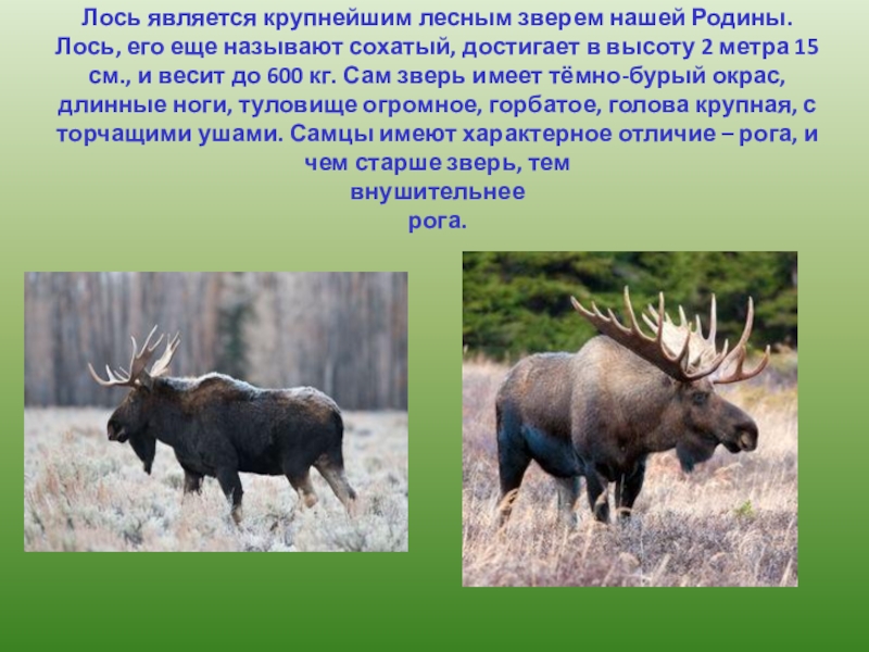 Лось является крупнейшим лесным зверем нашей Родины. Лось, его еще называют сохатый, достигает в высоту 2 метра