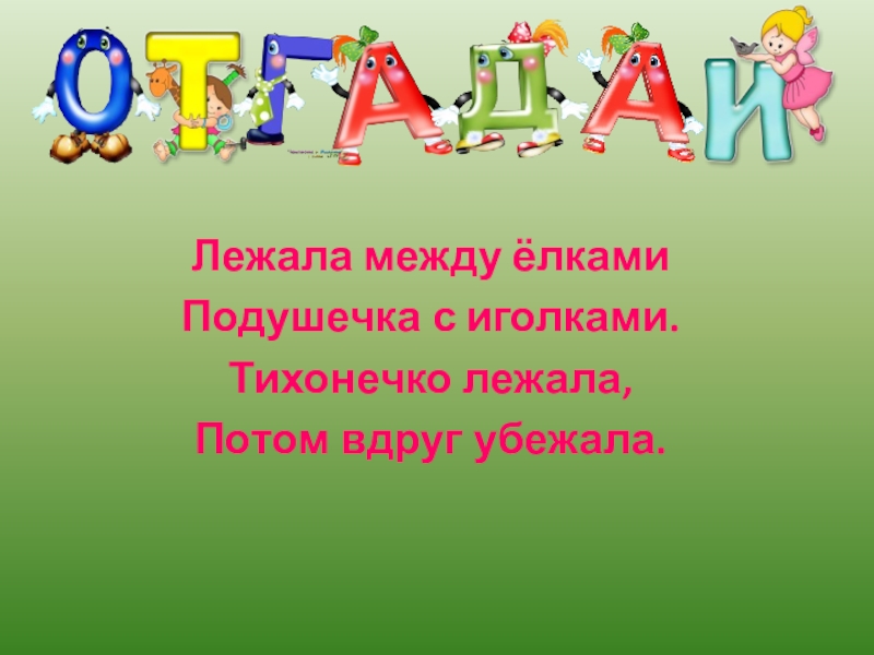 Лежала между ёлками Подушечка с иголками.Тихонечко лежала,Потом вдруг убежала.