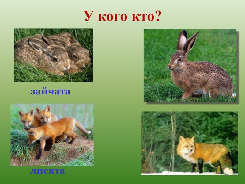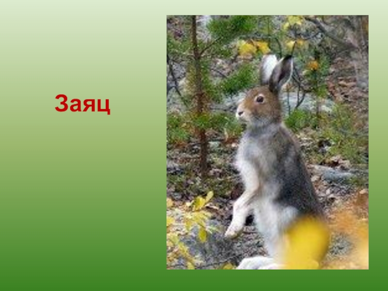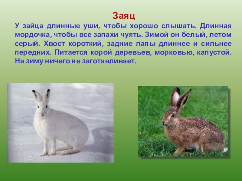 Заяц У зайца длинные уши, чтобы хорошо слышать. Длинная мордочка, чтобы все запахи чуять. Зимой он белый,