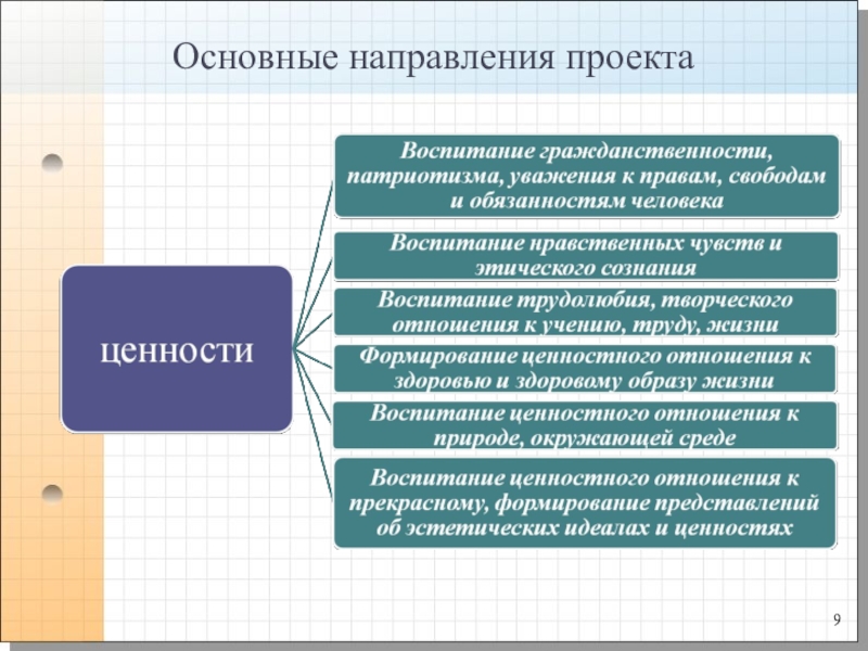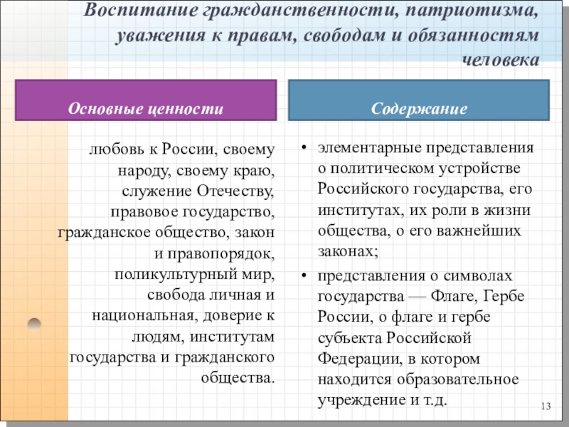 любовь к России, своему народу, своему краю, служение Отечеству, правовое государство, гражданское общество, закон и правопорядок, поликультурный мир, свобода личная и национальная, доверие к людям, институтам государства и гражданского общества.