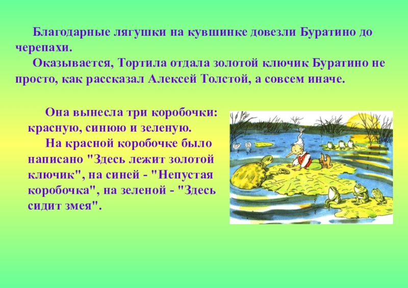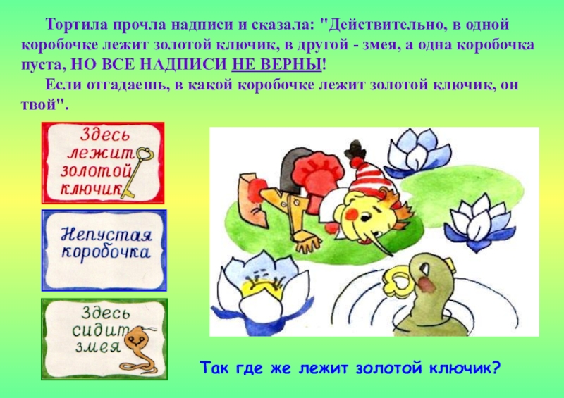 На красной коробочке было написано "Здесь лежит золотой ключик", на синей - "Непустая коробочка", на зеленой - "Здесь сидит змея".