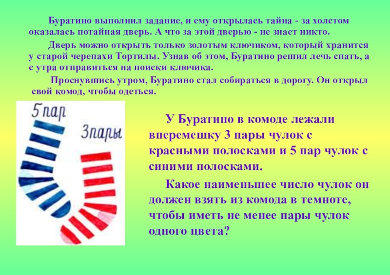У Буратино в комоде лежали вперемешку 3 пары чулок с красными полосками и 5 пар чулок с синими полосками.