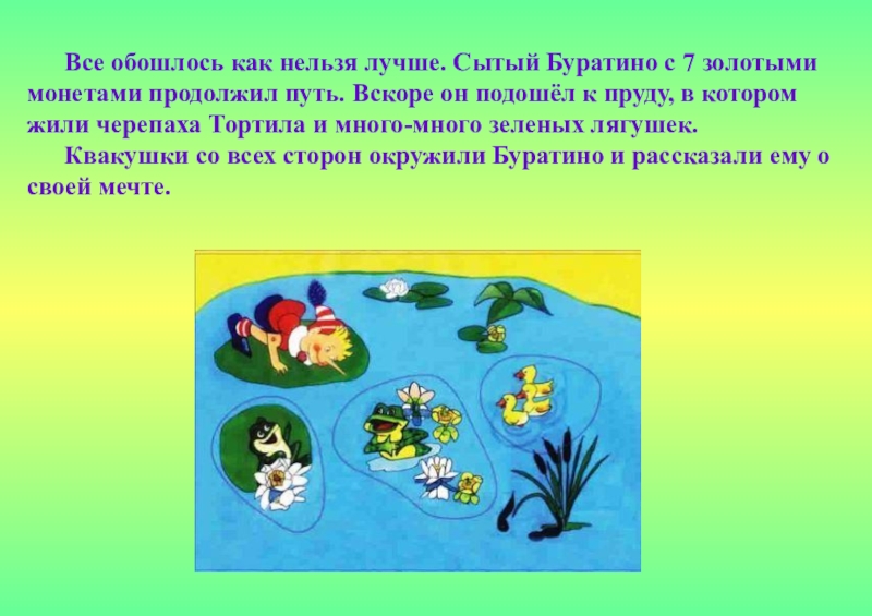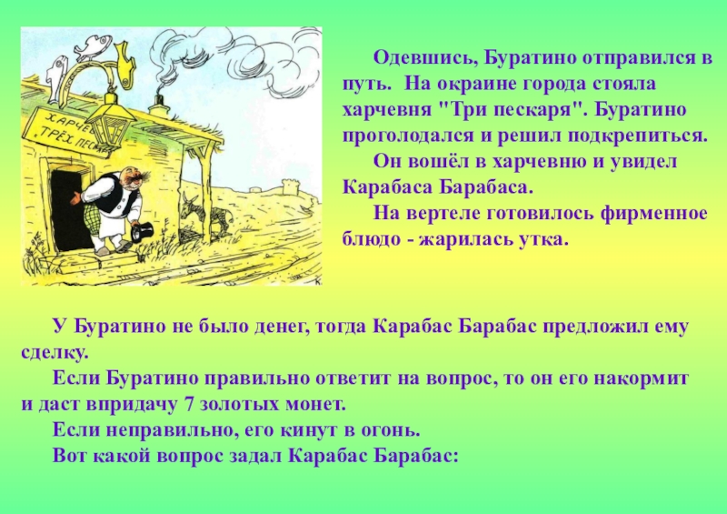 Если Буратино правильно ответит на вопрос, то он его накормит и даст впридачу 7 золотых монет.