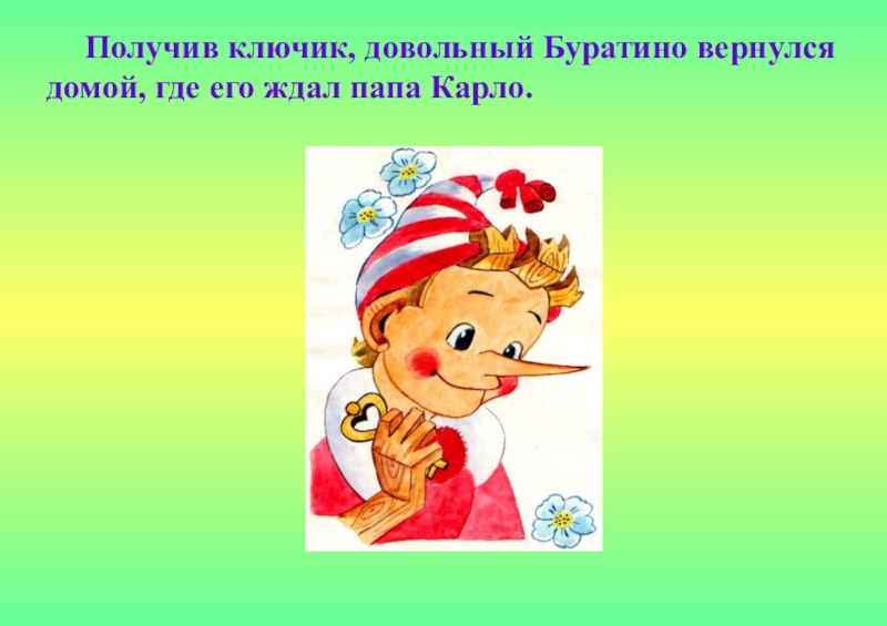 Буратино сорвал холст, вставил золотой ключик и несколько раз повернул его. Дверка открылась, и Буратино вместе с папой Карло вошли внутрь.