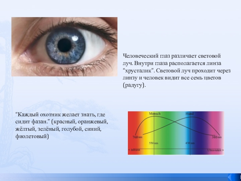 “Каждый охотник желает знать, где сидит фазан.” (красный, оранжевый, жёлтый, зелёный, голубой, синий, фиолетовый)