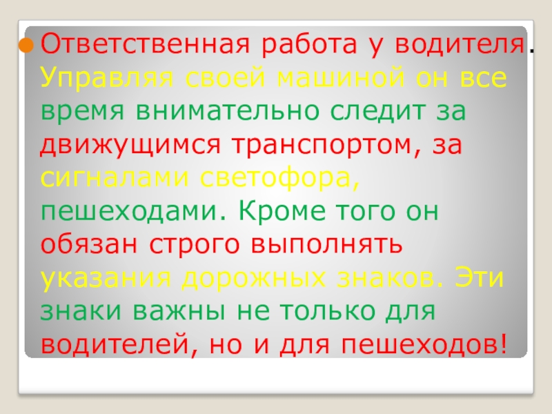Слайд 8Ответственная работа у водителя. Управляя своей машиной он все время внимательно