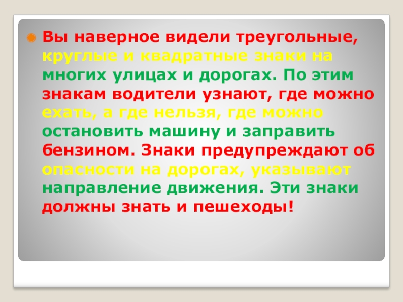 и дорогах. По этим знакам водители узнают, где можно ехать, а где нельзя, где можно остановить машину и заправить бензином. Знаки предупреждают об опасности на дорогах, указывают направление движения. Эти знаки должны знать и пешеходы!