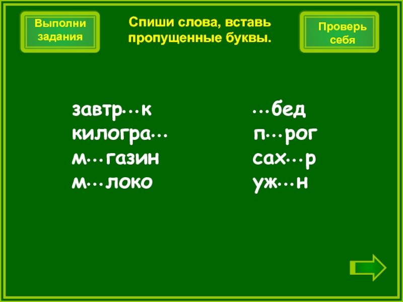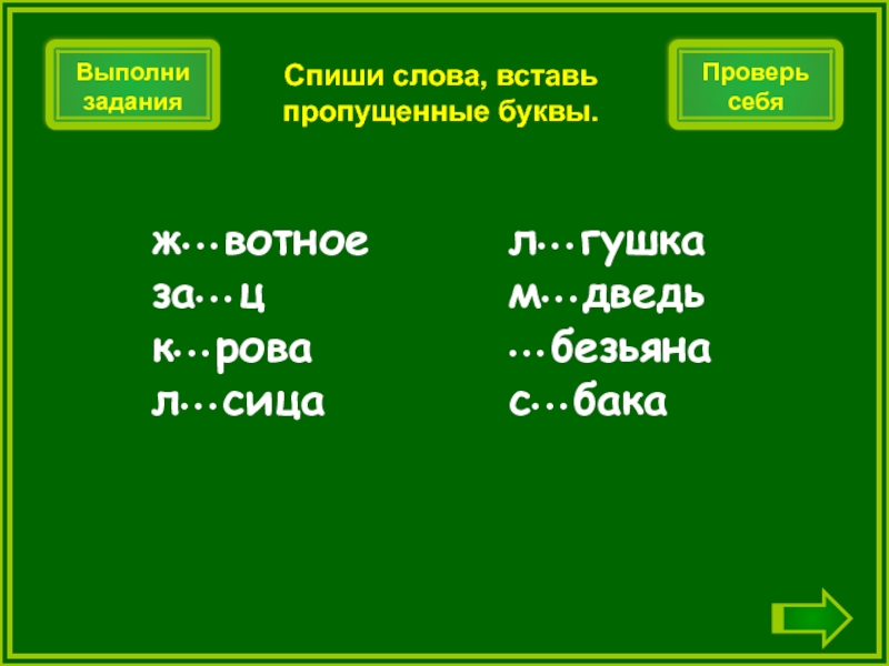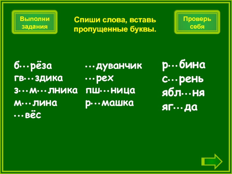 Спиши слова, вставь пропущенные буквы.