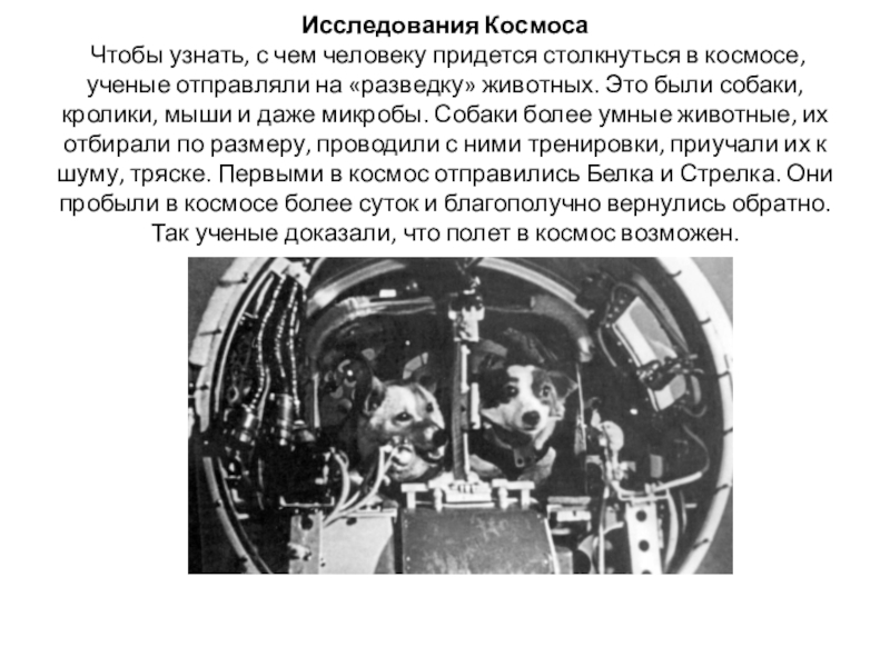 ученые отправляли на «разведку» животных. Это были собаки, кролики, мыши и даже микробы. Собаки более умные животные, их отбирали по размеру, проводили с ними тренировки, приучали их к шуму, тряске. Первыми в космос отправились Белка и Стрелка. Они пробыли в космосе более суток и благополучно вернулись обратно. Так ученые доказали, что полет в космос возможен.