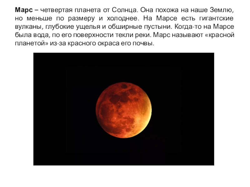 но меньше по размеру и холоднее. На Марсе есть гигантские вулканы, глубокие ущелья и обширные пустыни. Когда-то на Марсе была вода, по его поверхности текли реки. Марс называют «красной планетой» из-за красного окраса его почвы.
