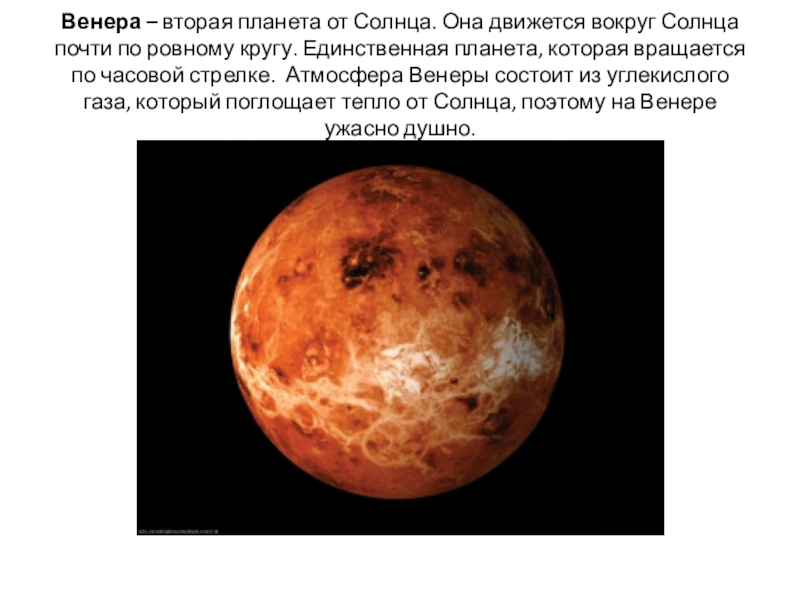 по ровному кругу. Единственная планета, которая вращается по часовой стрелке. Атмосфера Венеры состоит из углекислого газа, который поглощает тепло от Солнца, поэтому на Венере ужасно душно.