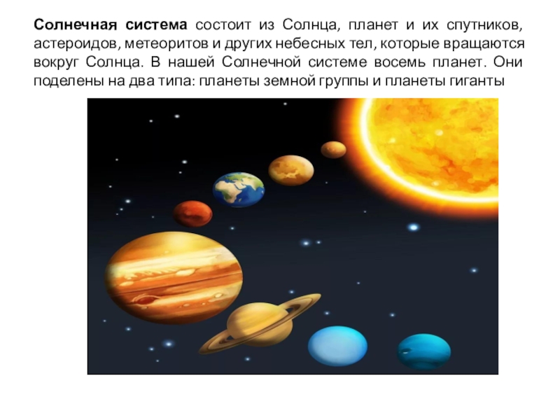 Солнечная система состоит из Солнца, планет и их спутников, астероидов, метеоритов и других небесных тел, которые вращаются вокруг Солнца. В нашей Солнечной системе восемь планет. Они поделены на два типа: планеты земной группы и планеты гиганты