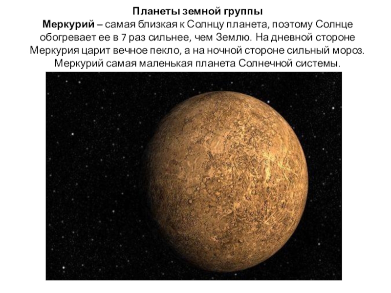 Слайд 4Планеты земной группы Меркурий – самая близкая к Солнцу планета, поэтому Солнце
