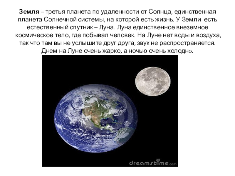 системы, на которой есть жизнь. У Земли есть естественный спутник – Луна. Луна единственное внеземное космическое тело, где побывал человек. На Луне нет воды и воздуха, так что там вы не услышите друг друга, звук не распространяется. Днем на Луне очень жарко, а ночью очень холодно.