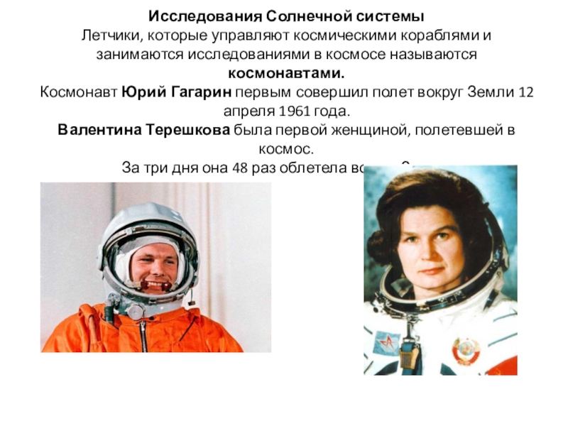 Исследования Солнечной системы Летчики, которые управляют космическими кораблями и занимаются исследованиями в космосе называются космонавтами. Космонавт Юрий