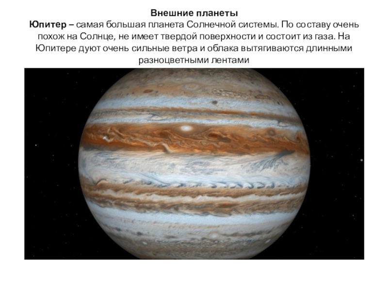 Слайд 8Внешние планеты Юпитер – самая большая планета Солнечной системы. По составу очень