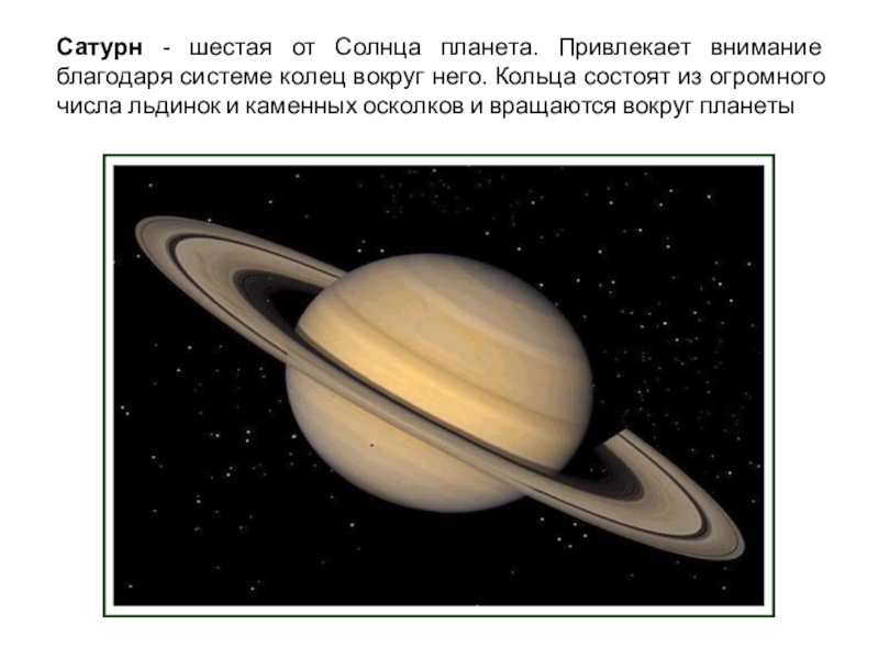 Слайд 9Сатурн - шестая от Солнца планета. Привлекает внимание благодаря системе колец