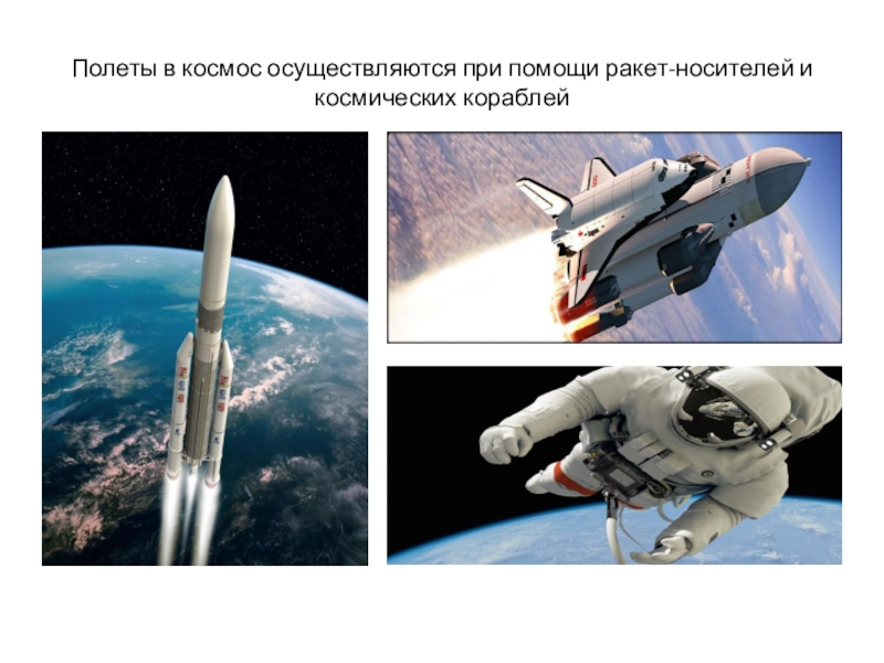 Слайд 13Полеты в космос осуществляются при помощи ракет-носителей и космических кораблей
