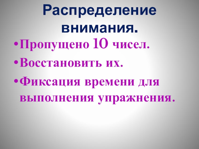 Распределение внимания.Пропущено 10 чисел.Восстановить их.Фиксация времени для выполнения упражнения.