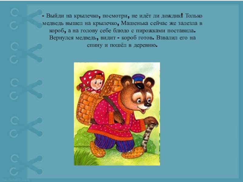 Слайд 10- Выйди на крылечко, посмотри, не идёт ли дождик! Только медведь