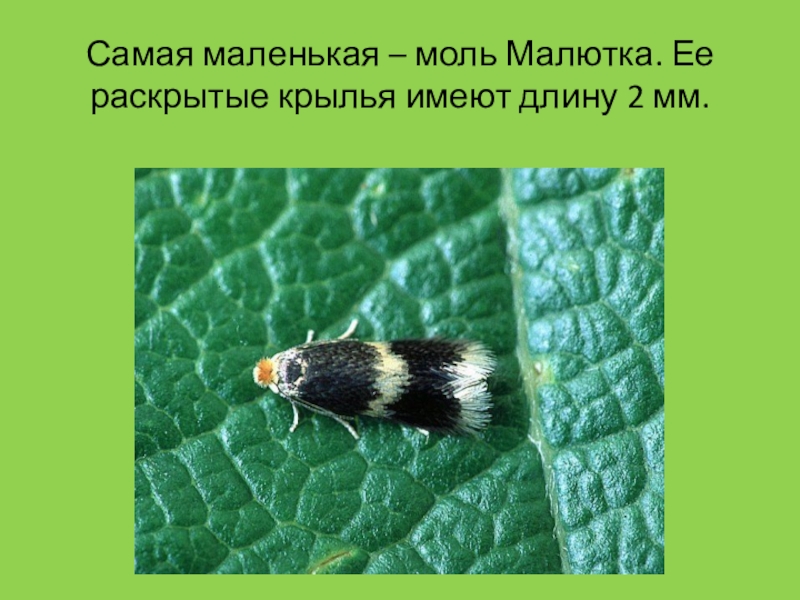 Слайд 13Самая маленькая – моль Малютка. Ее раскрытые крылья имеют длину 2