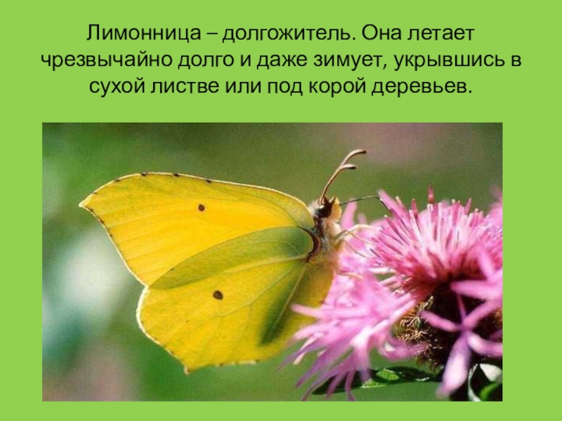 Слайд 8Лимонница – долгожитель. Она летает чрезвычайно долго и даже зимует, укрывшись