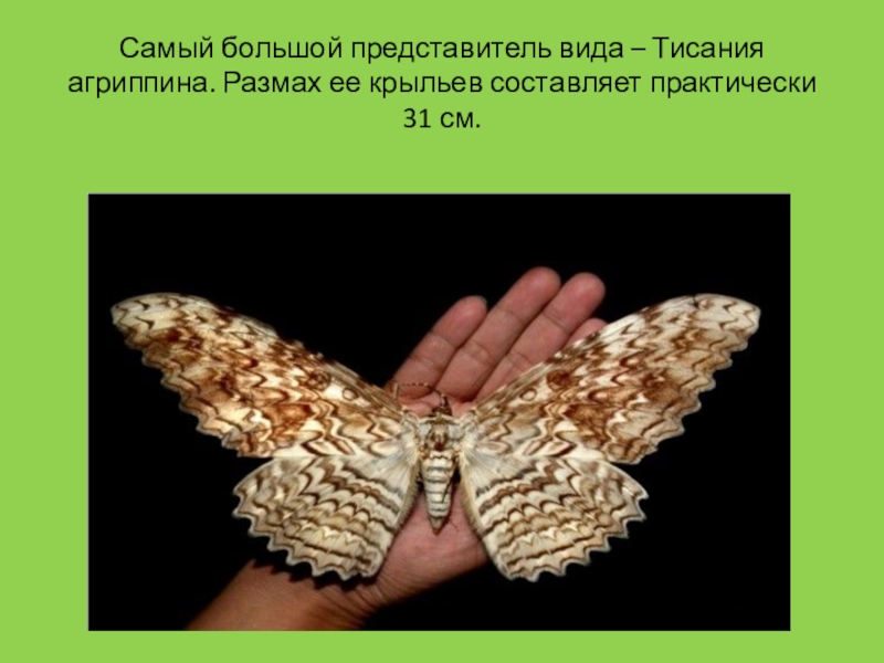 Слайд 11Самый большой представитель вида – Тисания агриппина. Размах ее крыльев составляет