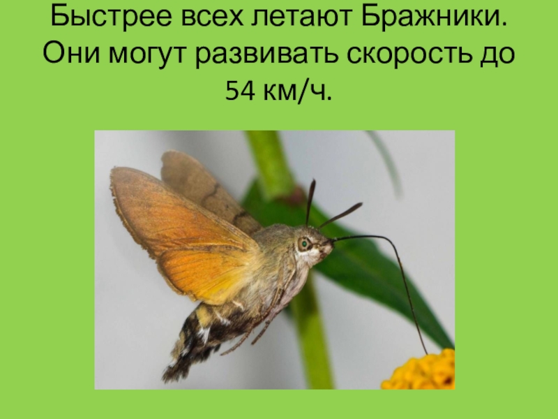 Слайд 15Быстрее всех летают Бражники. Они могут развивать скорость до 54 км/ч.