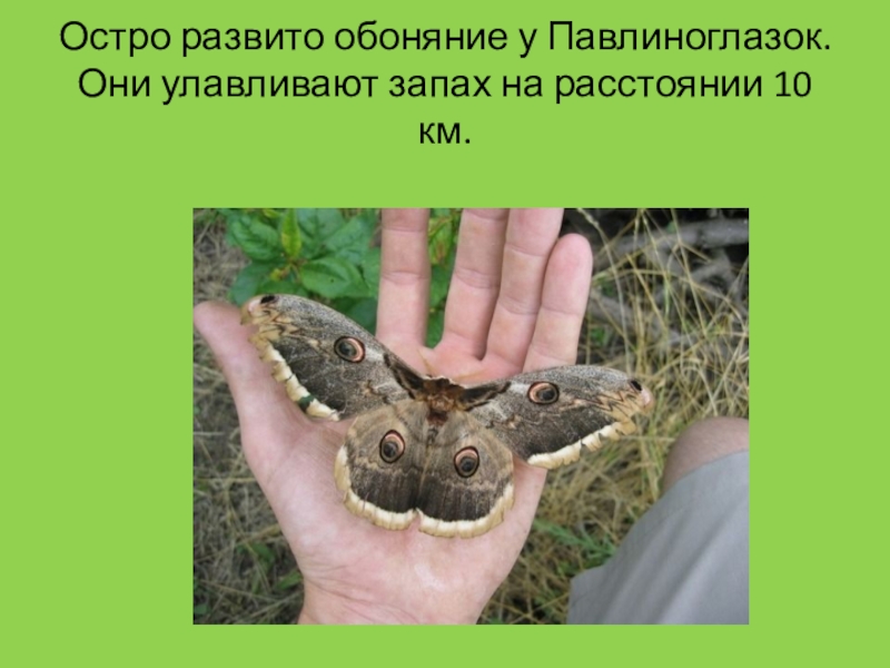 Слайд 14Остро развито обоняние у Павлиноглазок. Они улавливают запах на расстоянии 10