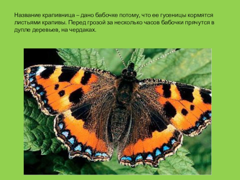 Слайд 7Название крапивница – дано бабочке потому, что ее гусеницы кормятся листьями