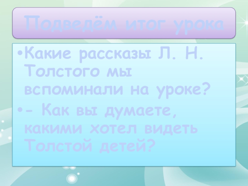 Подведём итог урокаКакие рассказы Л. Н. Толстого мы вспоминали на уроке?- Как вы думаете, какими хотел видеть