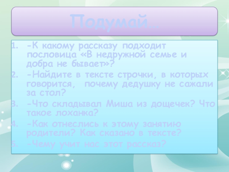 Подумай…-К какому рассказу подходит пословица «В недружной семье и добра не бывает»?-Найдите в тексте строчки, в которых