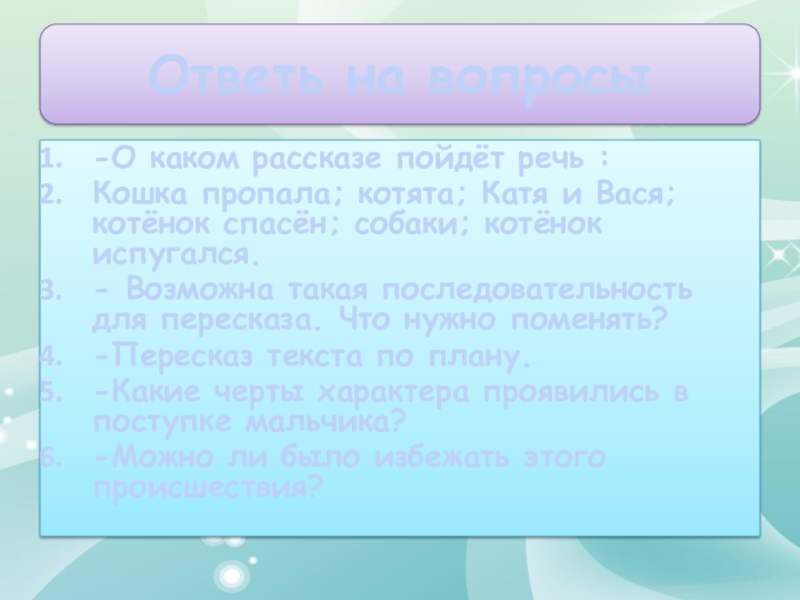 Ответь на вопросы-О каком рассказе пойдёт речь :Кошка пропала; котята; Катя и Вася; котёнок спасён; собаки; котёнок
